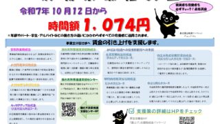 周知依頼 【重要】茨城県最低賃金が改定されます(令和7年10月12日発効予定) 令和7年度の茨城県最低賃金について、現行の時間額1,005円から、時間額1,074円への改定が答申されました。賃金引き上げへのご対応と、適切な周知をお願いいたします。改定の概要と適用開始日茨城県で働くすべての労働者に適用される「茨城県最低賃... 2025.10.08 周知依頼